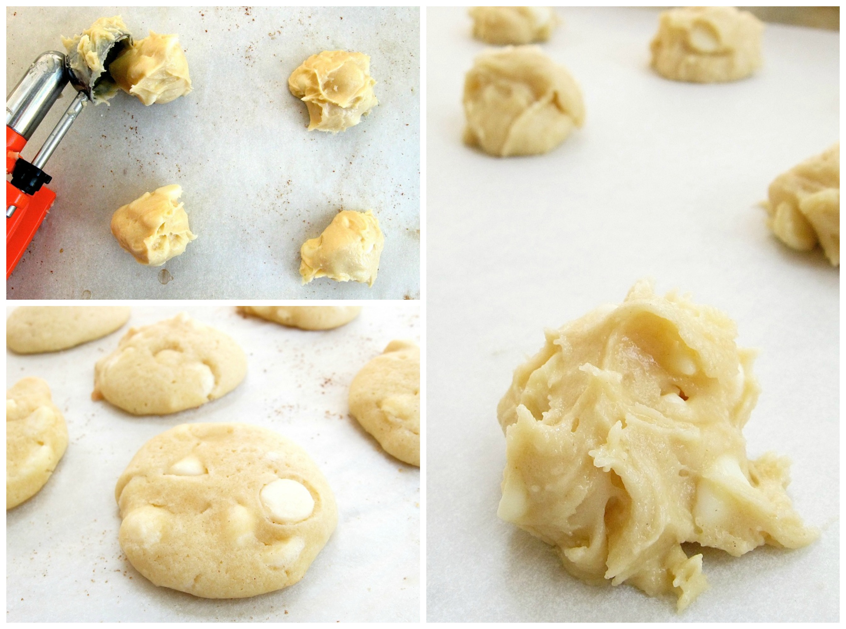 Drop 1" balls of dough onto the prepared baking sheets; a teaspoon cookie scoop works well here. Space the cookies about 1 1/2" apart.