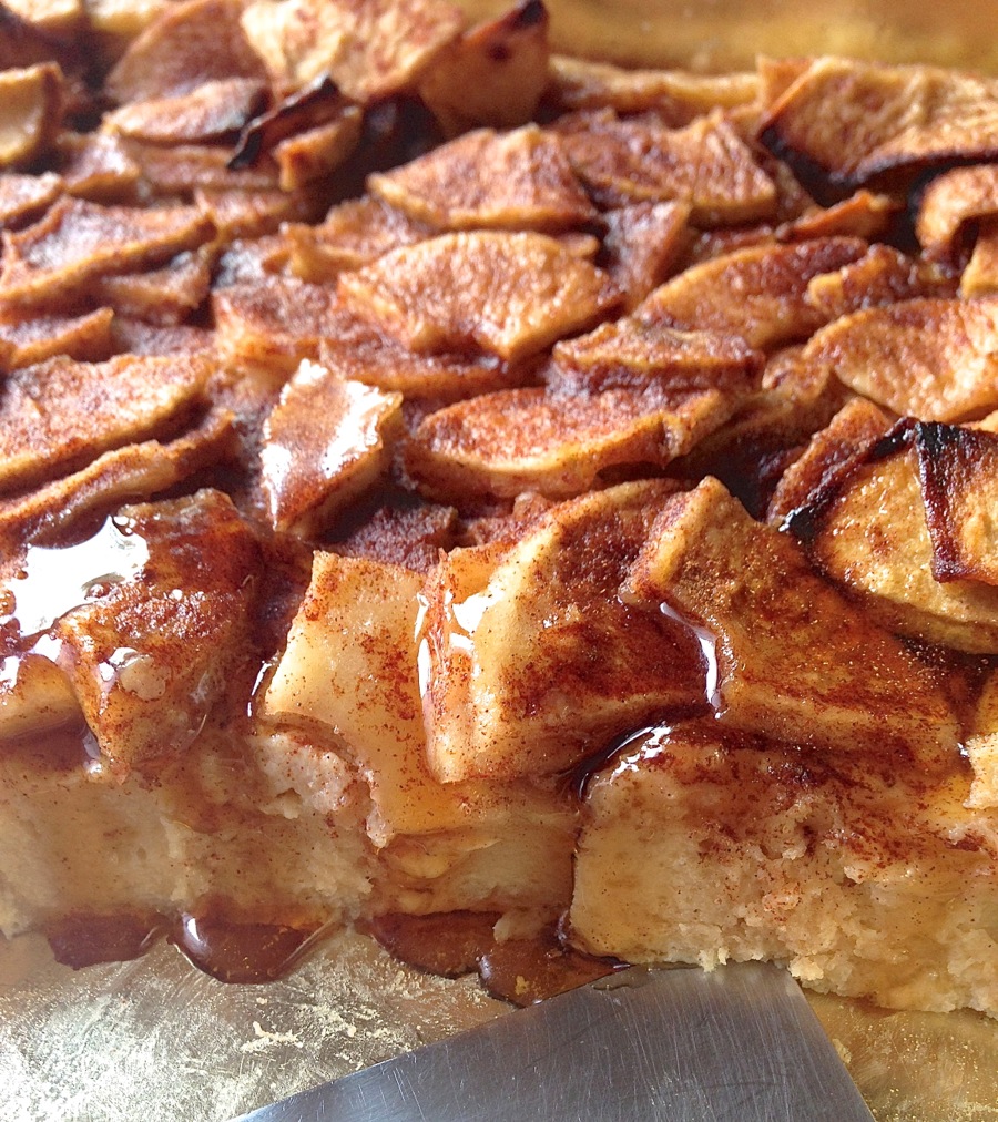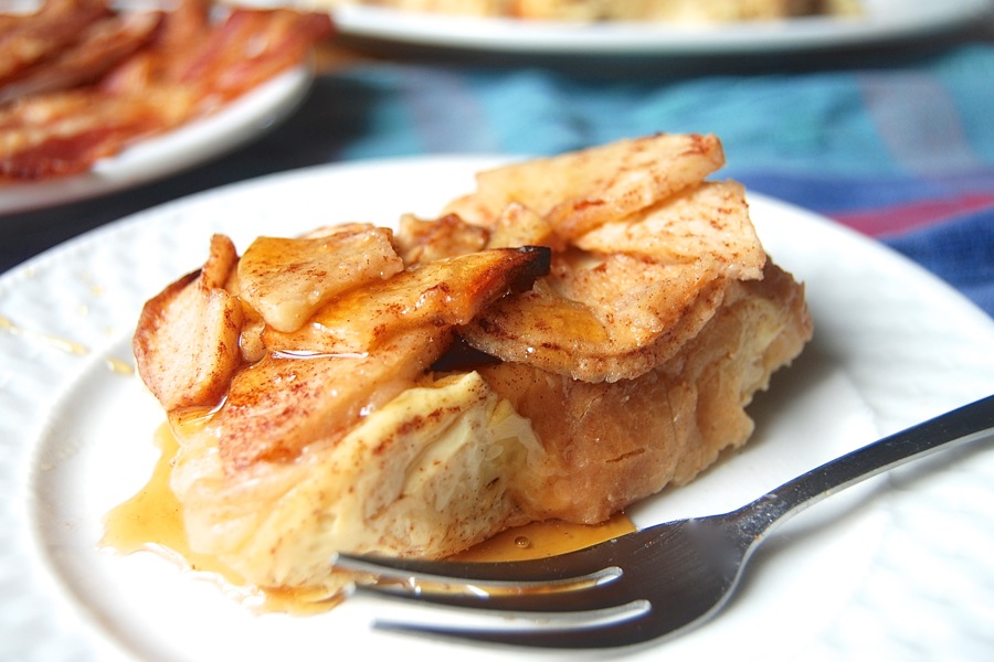 Truthfully? This isn't a rock star in the looks department. But the tender/crisp apples atop soft bread and custard, and the complementary flavors of cinnamon and maple and apple (and bacon!) make it a dish whose beauty is in the eating, rather than the beholding.