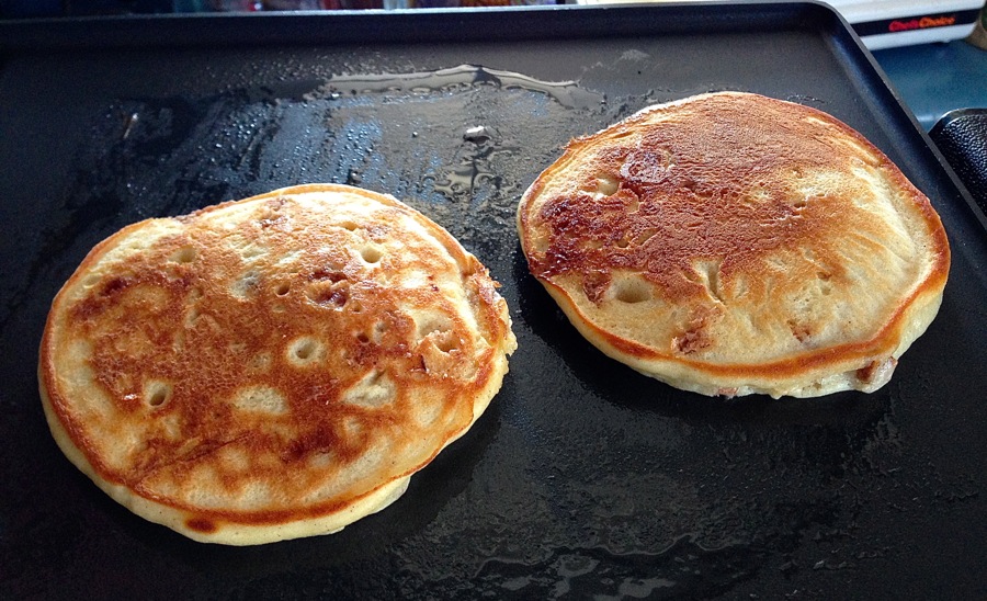 Spoon the batter by the 1/4-cupful onto the lightly greased griddle; a muffin scoop* works well here. When you see the edges begin to look dry and bubbles come up and not break, turn the pancakes over to cook for about a minute on the second side, until cooked through.