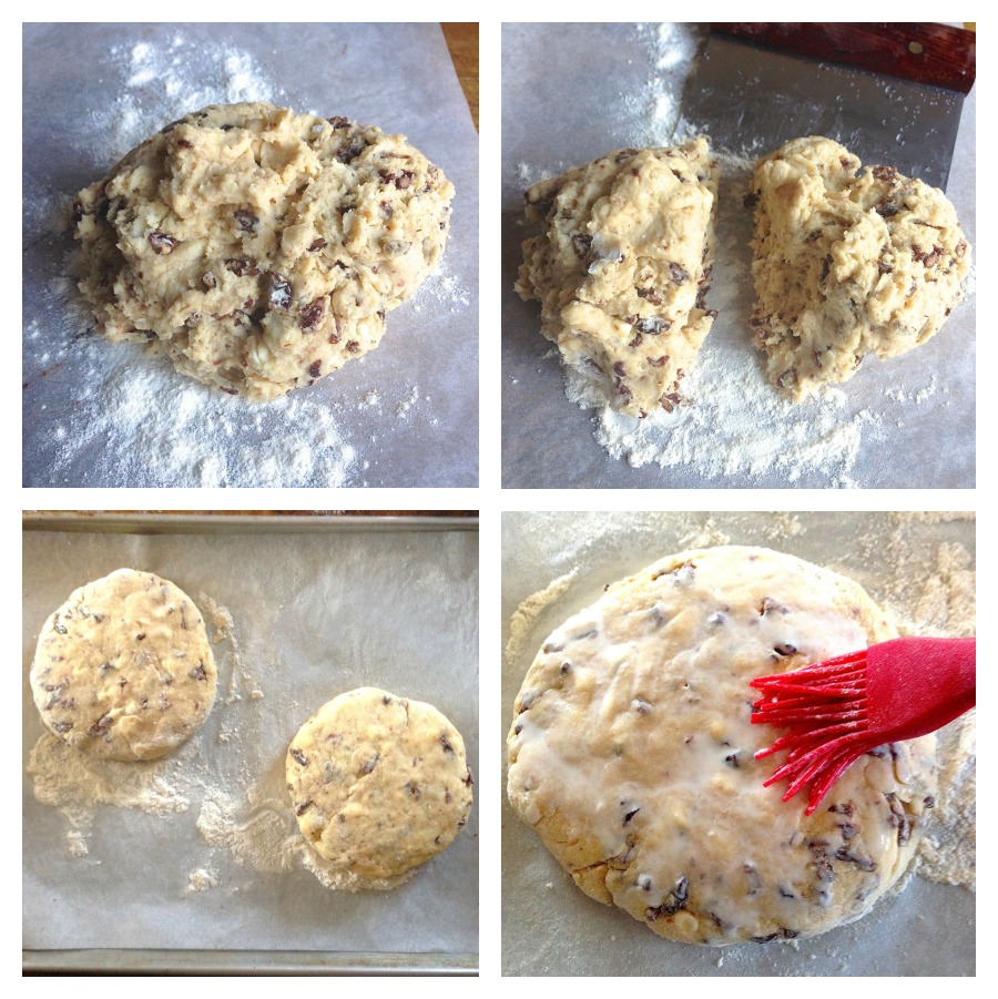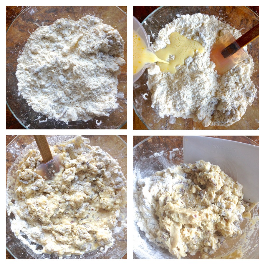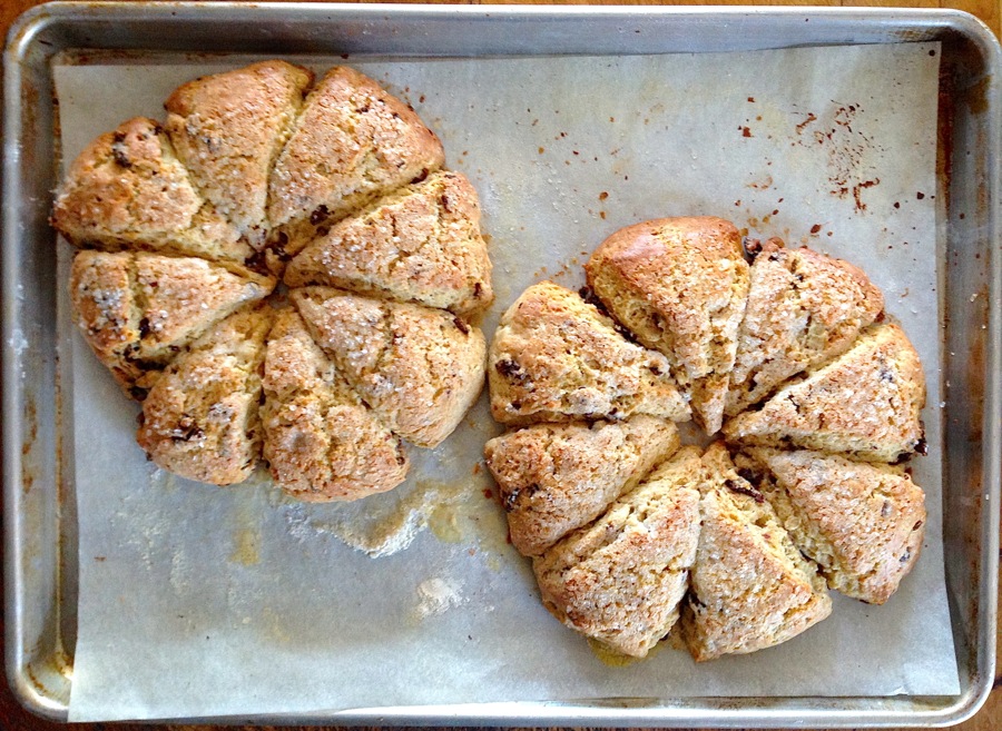 Notice the chunks of butter in the cross section of scone pictured at right, above; leaving some of the butter in largish chunks will help keep the scones flaky.