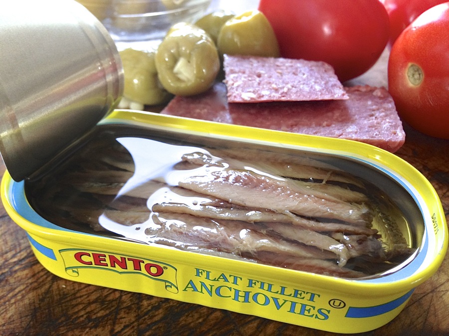 And the filling? These "authentic" Italian ingredients: salami and anchovies, garlic and olives. Tomatoes, and "Italian cheese."