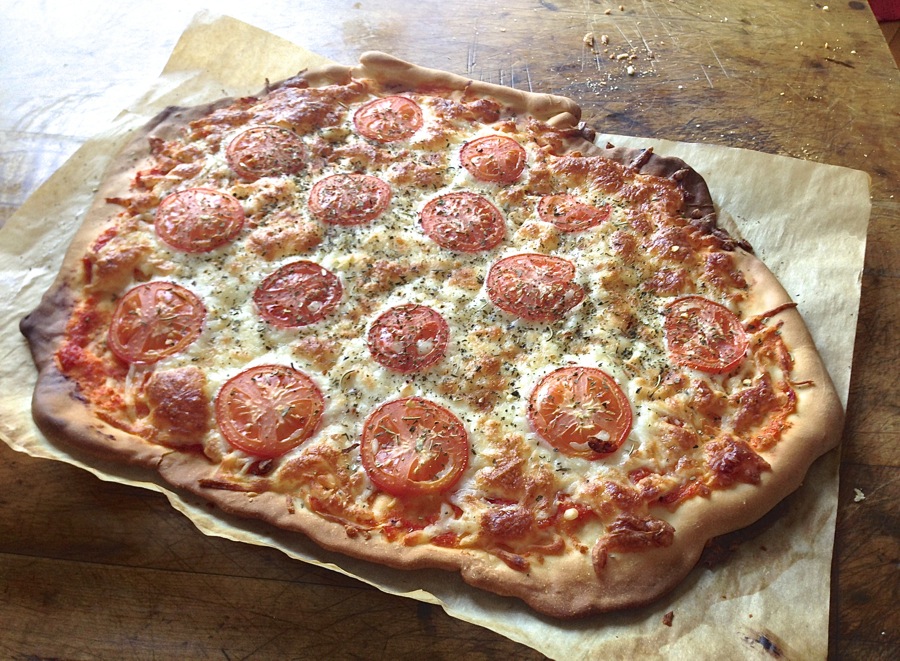 The original Italian restaurant pizza (also pictured at the very top of this post): early 20th century New York/New Haven super-thin-crust pizza, topped with marinara; mozzarella or Romano; garlic and, as an option, sliced tomatoes. Our recipe for Thin-Crust Pizza is a worthy clone.