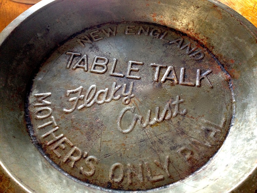Since Betty, like Gourmet, is thinking of pizza as pie, I figured I'd best use my oldest pie pan – this yard-sale treasure, gifted to me from my fellow blogger, MJ.