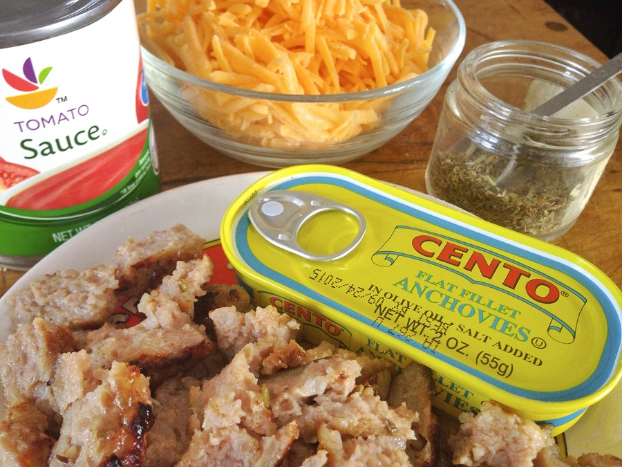 And the topping: oh, my, we're back to anchovies and meat – canned pork sausage (dare I think Vienna?). I substituted half a pound of cooked, crumbled breakfast sausage.