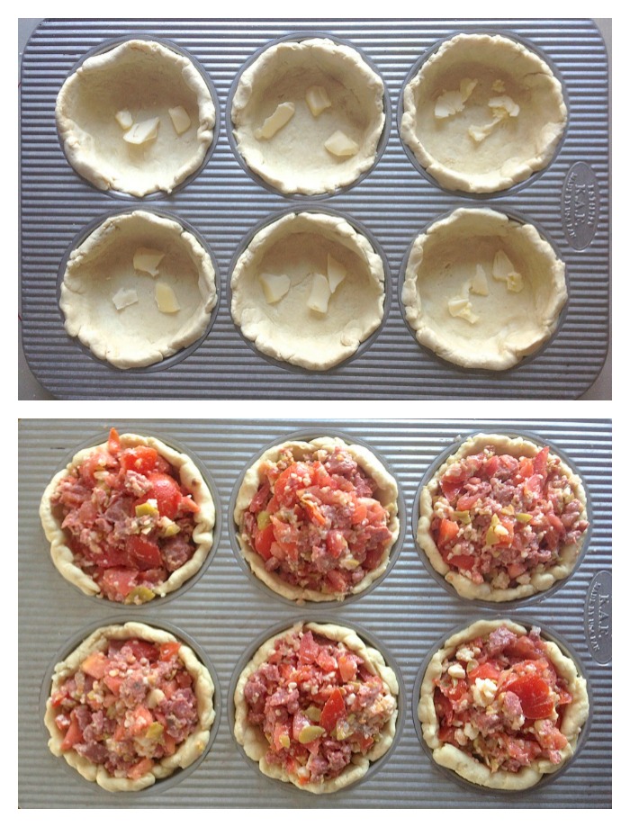 Everything into a bowl. Chop-chop. Mounded into the crusts (which I'd baked a couple of minutes to "set," as directed – though in retrospect, this step seems unnecessary; it didn't even melt the butter).