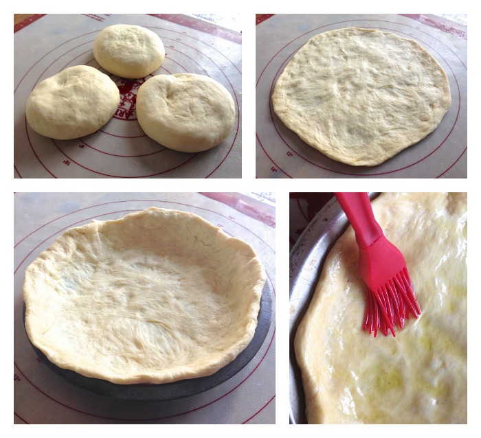 From that point on, the recipe is a cinch to follow. Divide the roll mix in thirds; roll each piece about 1/8" thick; and place in 9" pie pans (don't bother greasing the pans). Do, however, brush the crusts with olive oil – because, why not? It'll help them brown, and adds both crispness, and flavor.