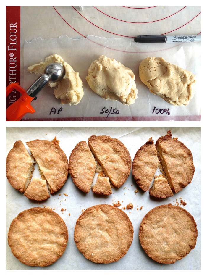 Five batches of cookie dough: 100% all-purpose flour; 50/50; and three 100% golden wheat flour doughs, using increasing amounts of liquid – in this case, orange juice.