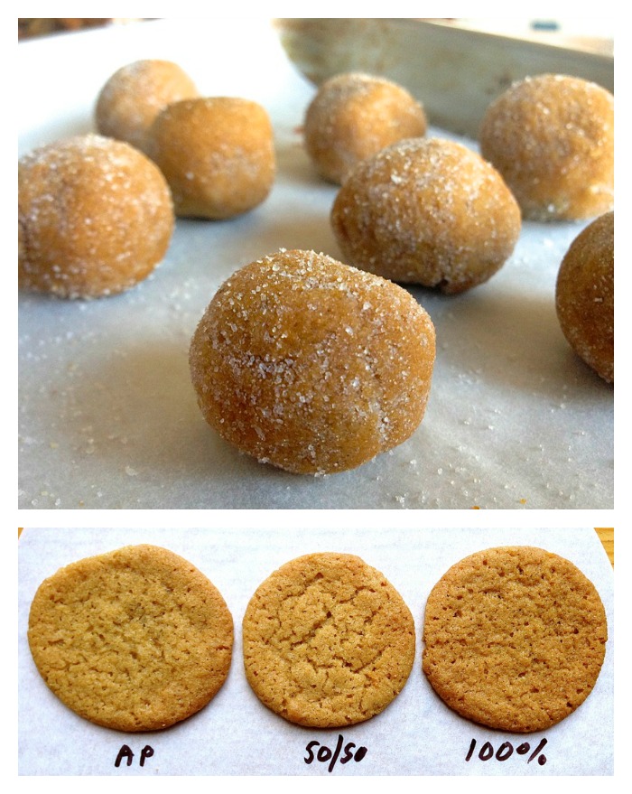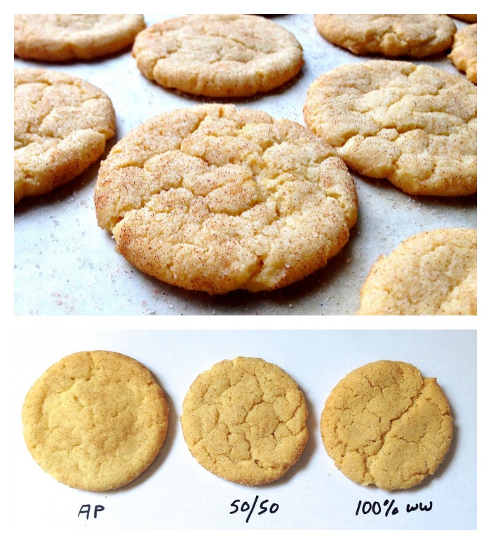 And, once baked, it's virtually impossible to see any difference between the white flour and 50/50 cookies; the 100% golden wheat cookies are a shade darker.