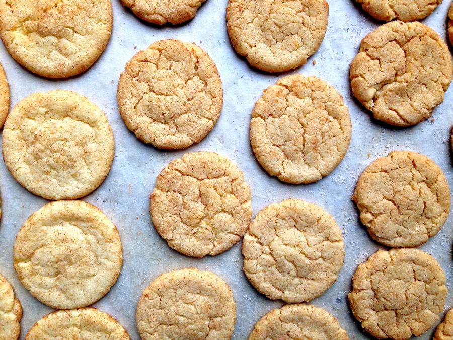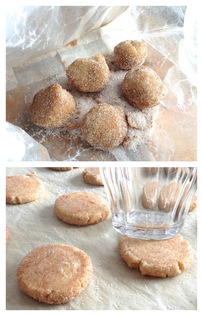 Mix, roll into balls, shake in cinnamon-sugar, flatten...