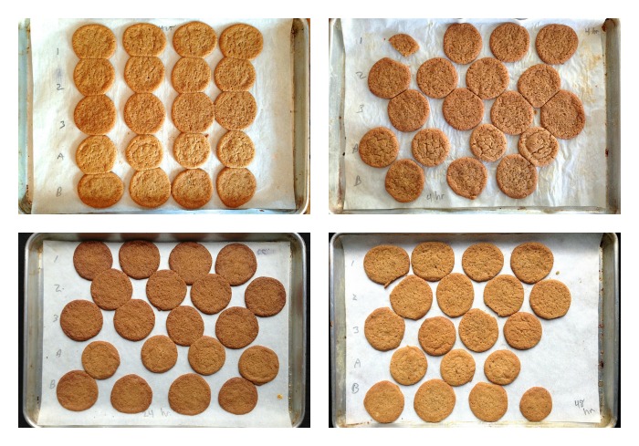 The 100% all-purpose flour cookies (B); and the 100% golden wheat cookies with added liquid (1, 2, and 3) spread the same amount, from 4 hours right through 48 hours. The 50/50 cookies (A) spread a bit less.