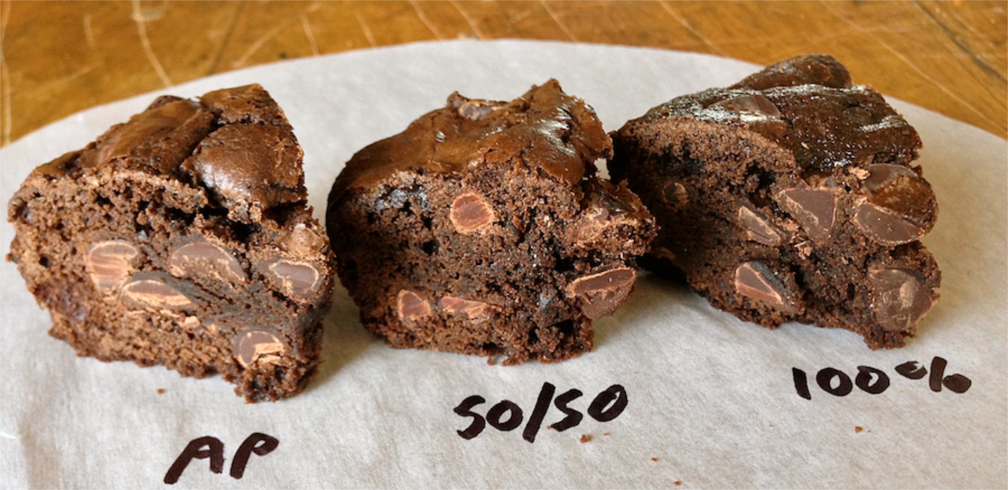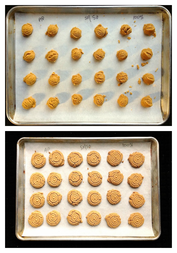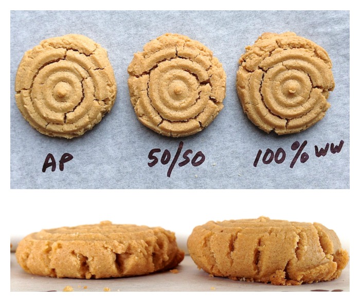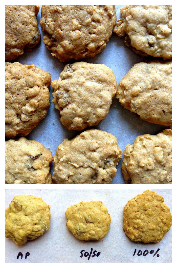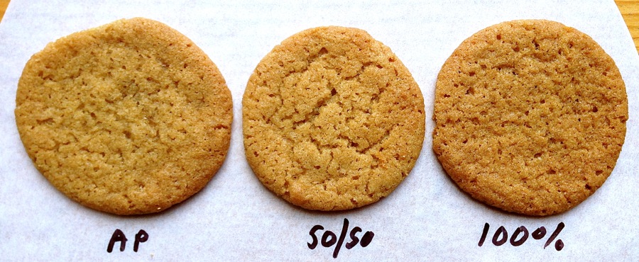 And texture? The mouth feel of the 100% whole wheat cookies is very slightly more "grainy" than that of either the 50/50 or AP cookies.