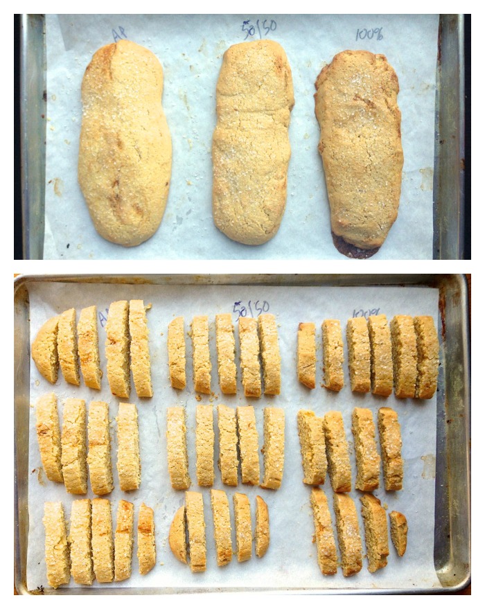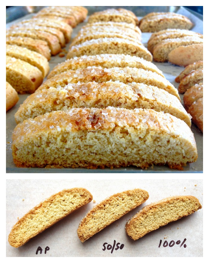 Still, the resulting biscotti are delicious, no matter what their percentage of golden wheat flour. Slightly darker, slightly smaller, the whole wheat biscotti don't reveal any bran in their mouth-feel; the crunchiness of the cookie negates the bran's grit.