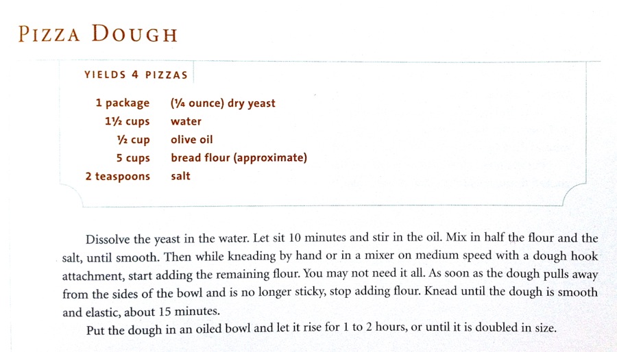 I've made this pizza crust more than once – it yields four 8" crusts, thinner in the center, thicker at the edges; a nice individual size. The dough is a pleasure to work with.