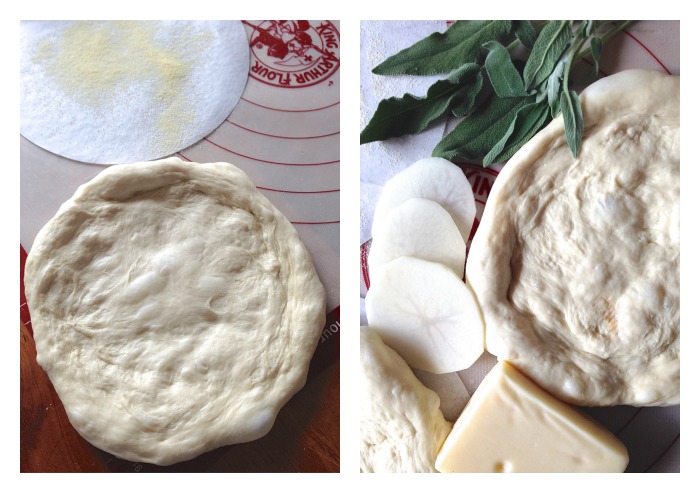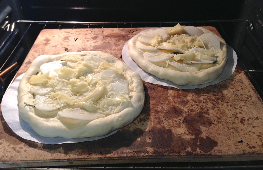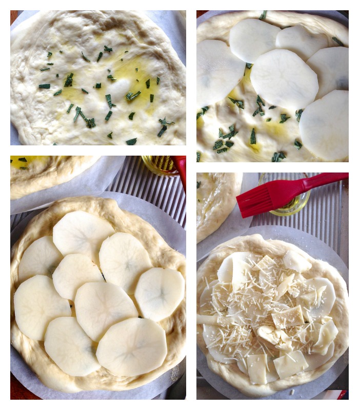 I forge ahead, brushing the crusts with olive oil, sprinkling with chopped fresh sage, then layering on the potatoes. I figure this is a good time to use the salt and pepper, before adding the cheeses.