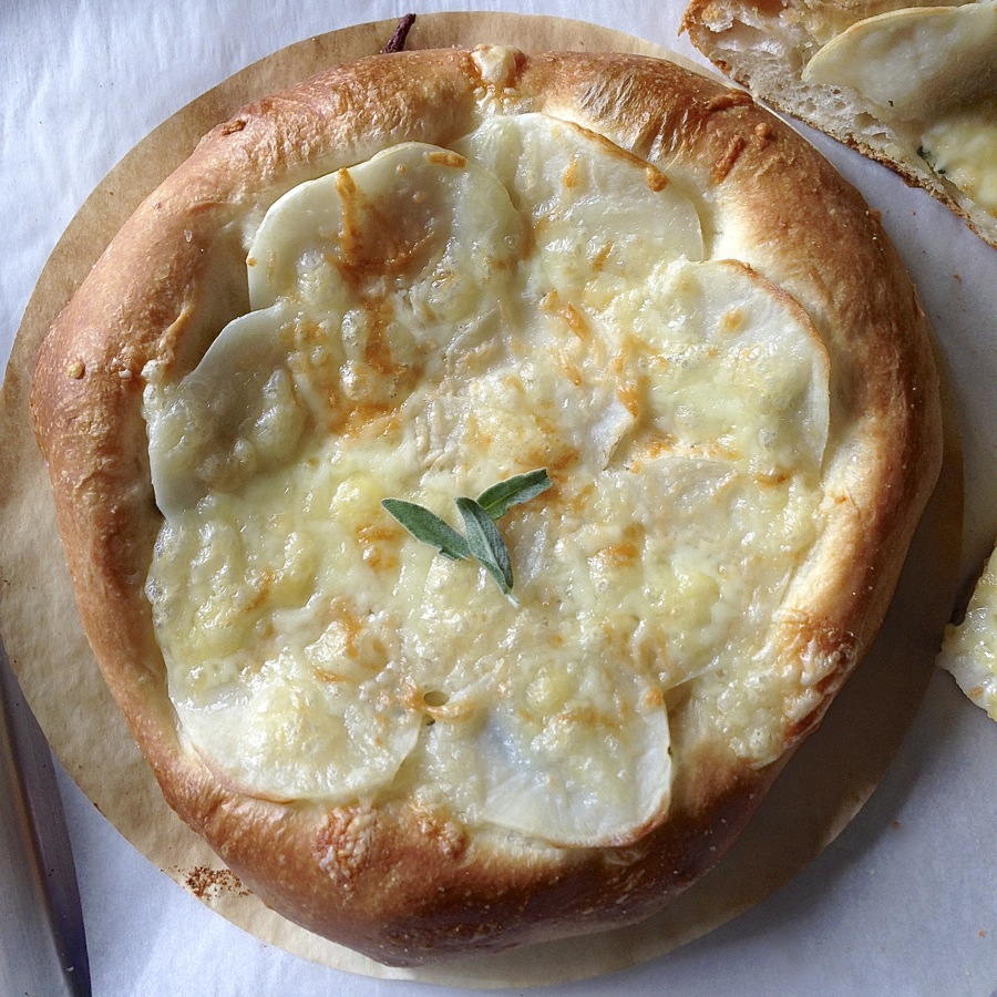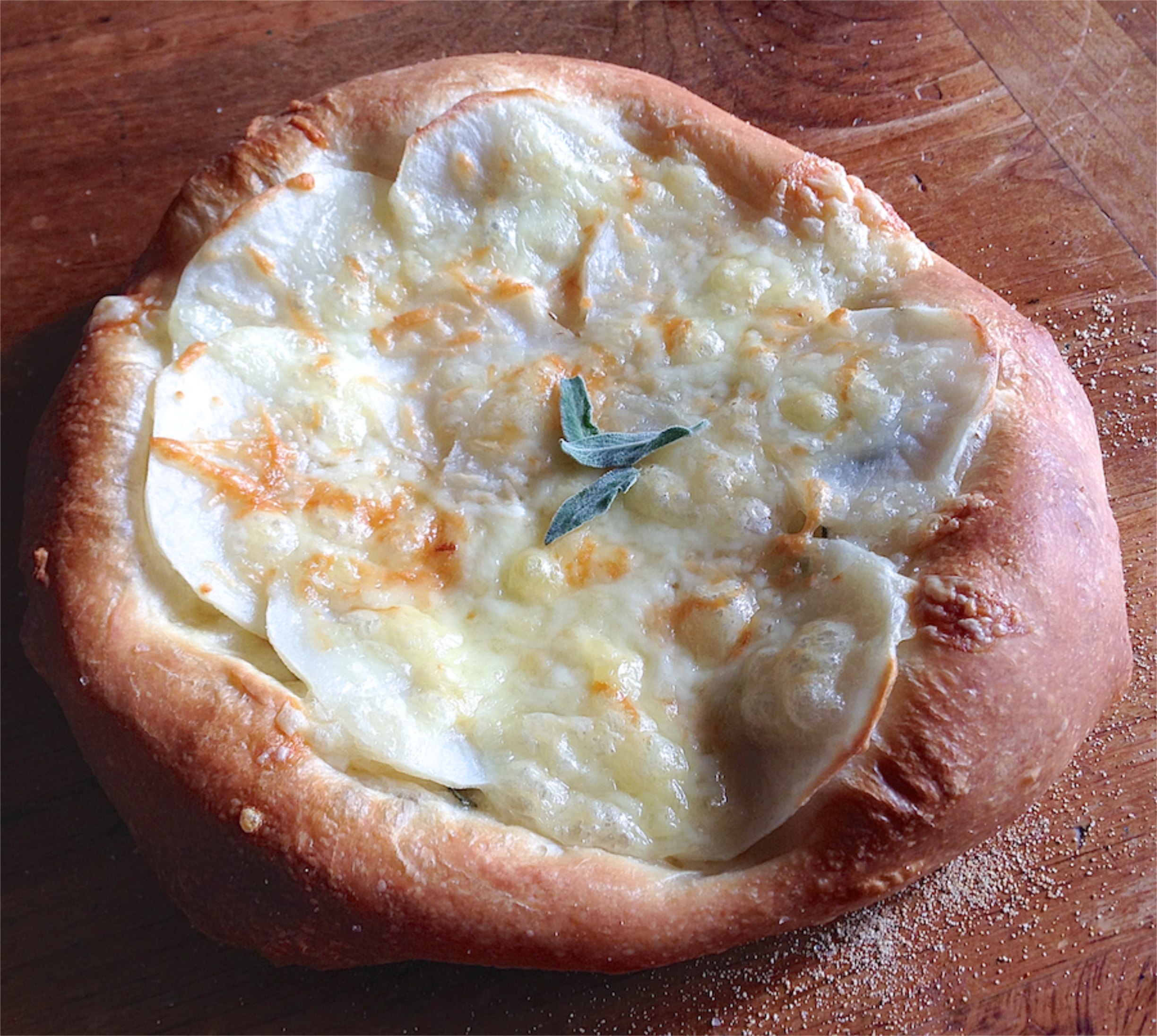 For topping, the chef calls for thinly sliced (1/8" thick) "yellow, waxy" potatoes (I choose Yukon Gold); Fontina cheese; fresh sage, and freshly grated Parmesan.