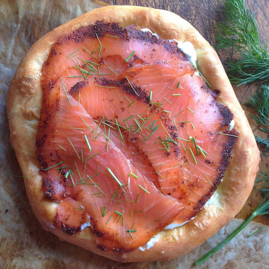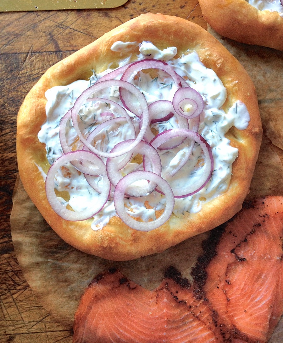Its toppings are simple: thinly sliced red onion; sour cream mixed with chopped shallots and fresh dill weed; and smoked salmon. The garnish is chopped chives and caviar.