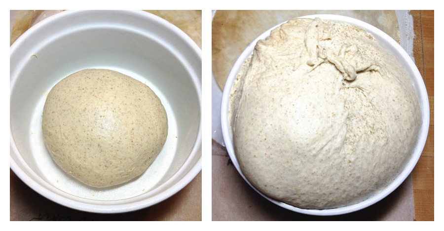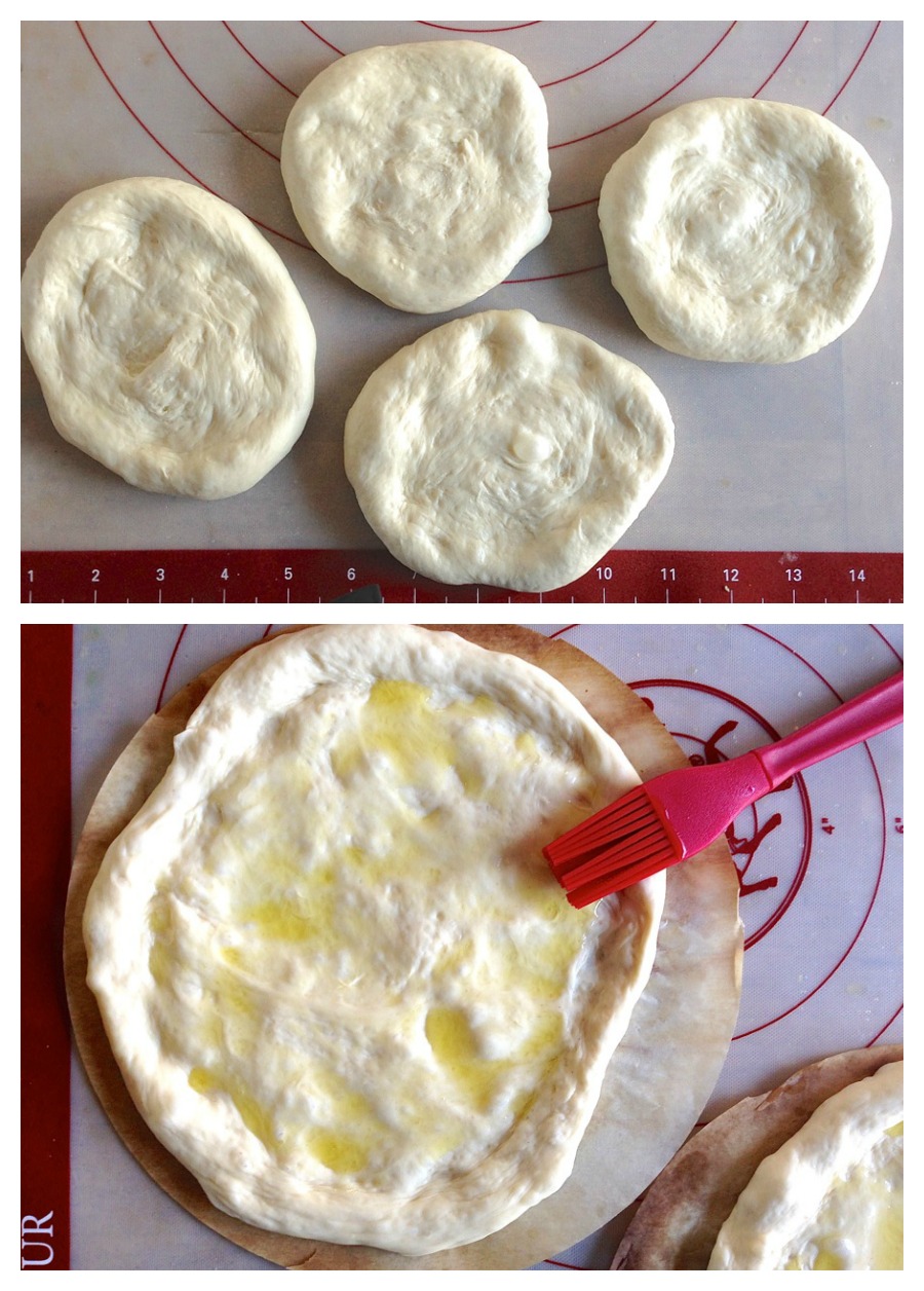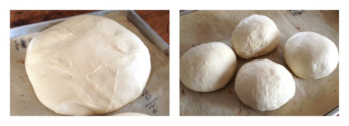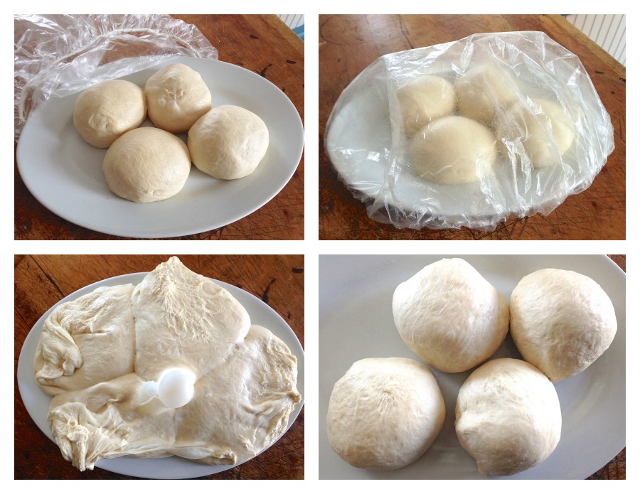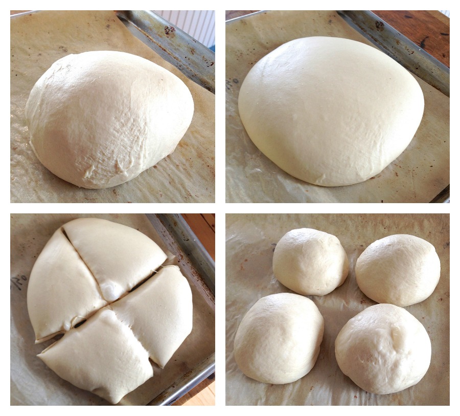 So, I set the kneaded dough on a baking sheet (upper left); let it rise (upper right), then divide it into four pieces, and shape each piece into a ball.