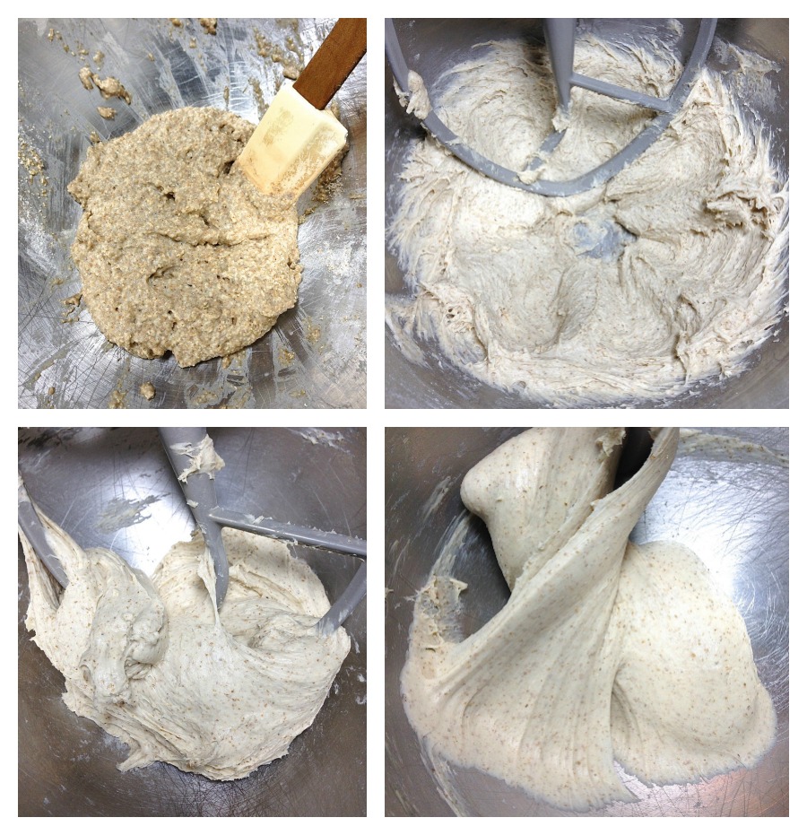 When you're working with REALLY sticky dough, it helps to beat it for a few minutes before switching to the dough hook. See how it sticks to the sides of the bowl (upper right), but finally clears the sides (lower left) after a few minutes of beating?