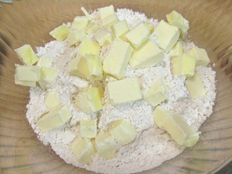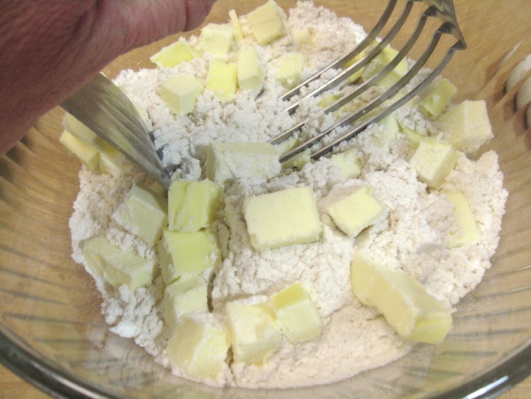 Work the butter into the dry ingredients using a pastry blender or two forks. You can even use your hands, if you work quickly and don't allow the butter to become warm. Should the temperature of the butter get too warm, you'll risk the losing flaky texture of your final product.