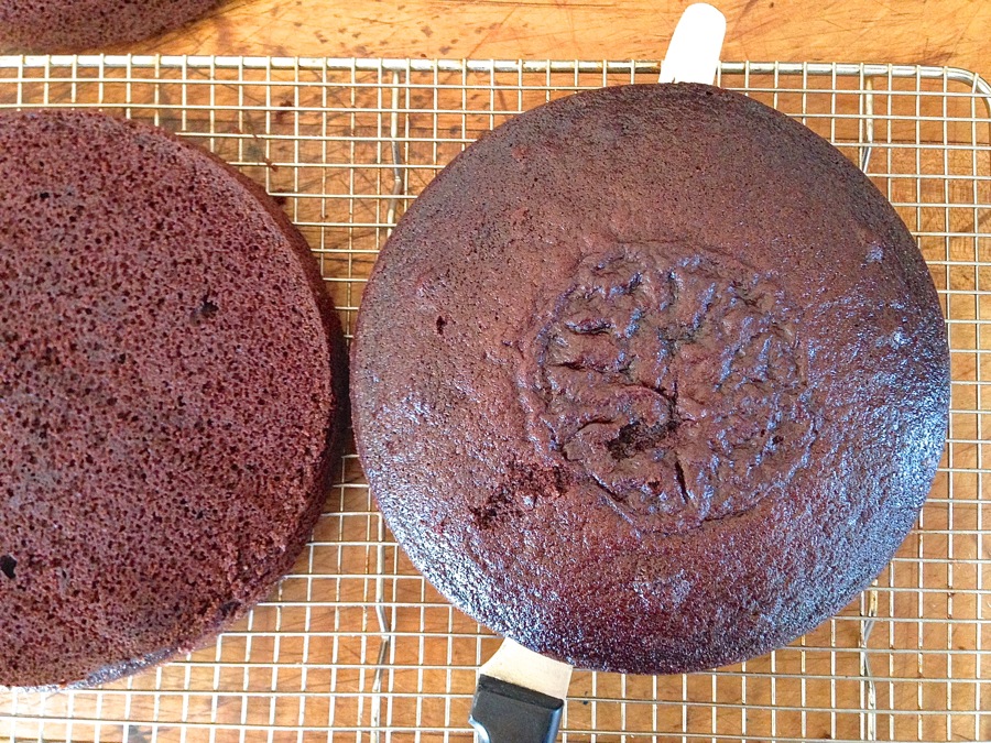 Cut the domed tops off both cake layers; these will become your crumb coating, so hide them somewhere where they won't get scarfed up by your "little helpers."
