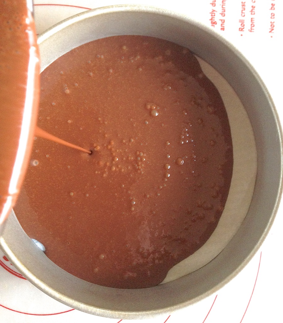 Now, it you poured the filling into an 8" round cake pan, you should be able to center it over the cake, tap the pan to release the filling/parchment, then peel off the parchment.