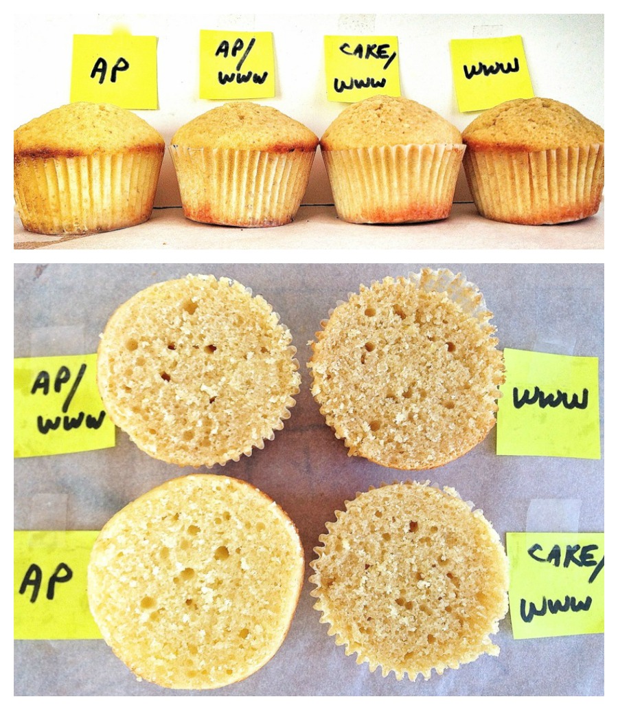 Texture-wise, another interesting (though somewhat expected) result: the cupcake made with cake flour, even though it's also 50% whole wheat, has the finest texture.