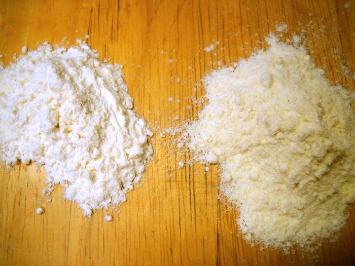 Here's a little side-by-side shot of unbleached all-purpose flour (l) and semolina flour (r). The semolina is coarser and definitely more yellow in color. You can see it's more granular, as well. Just what we want for a crisp, crunchy crust.