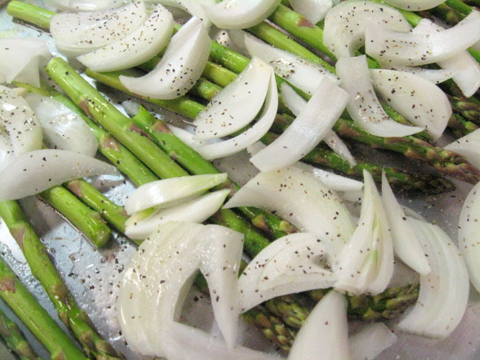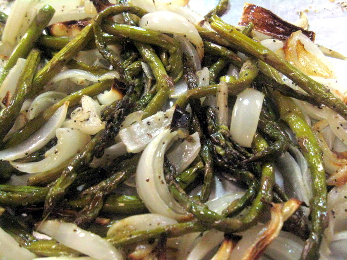 Earlier in the week, or anytime the oven is on anyway, slice up some sweet white onions. Toss with some fresh asparagus spears, olive oil, salt, and pepper, and roast until deeply browned and caramelized.