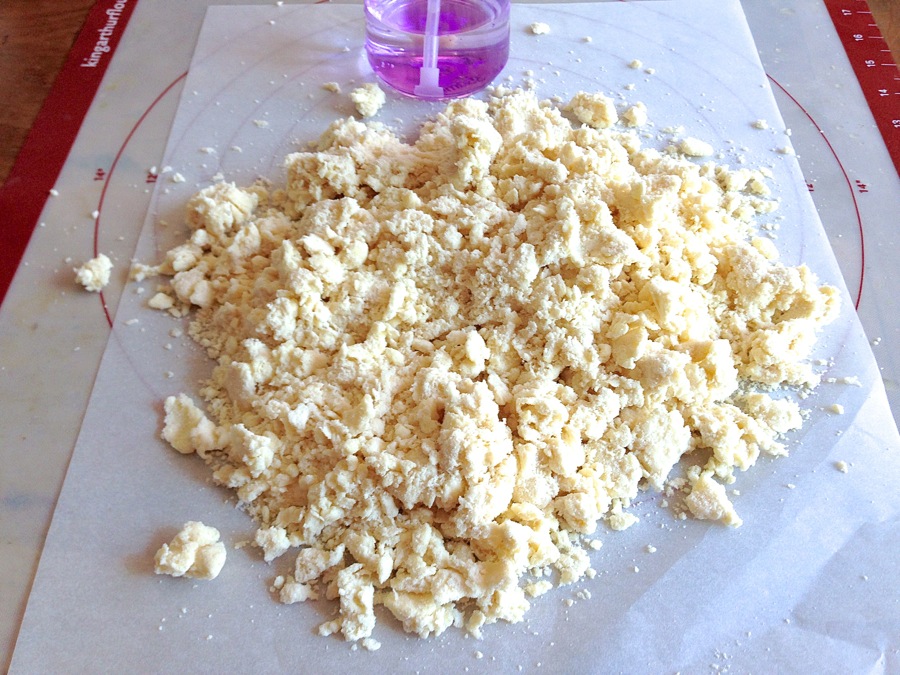 Once your flour and fats are combined, and you've added enough water that large clumps have started to form – but the dough isn't holding together yet – dump everything out onto a sheet of parchment or waxed paper.