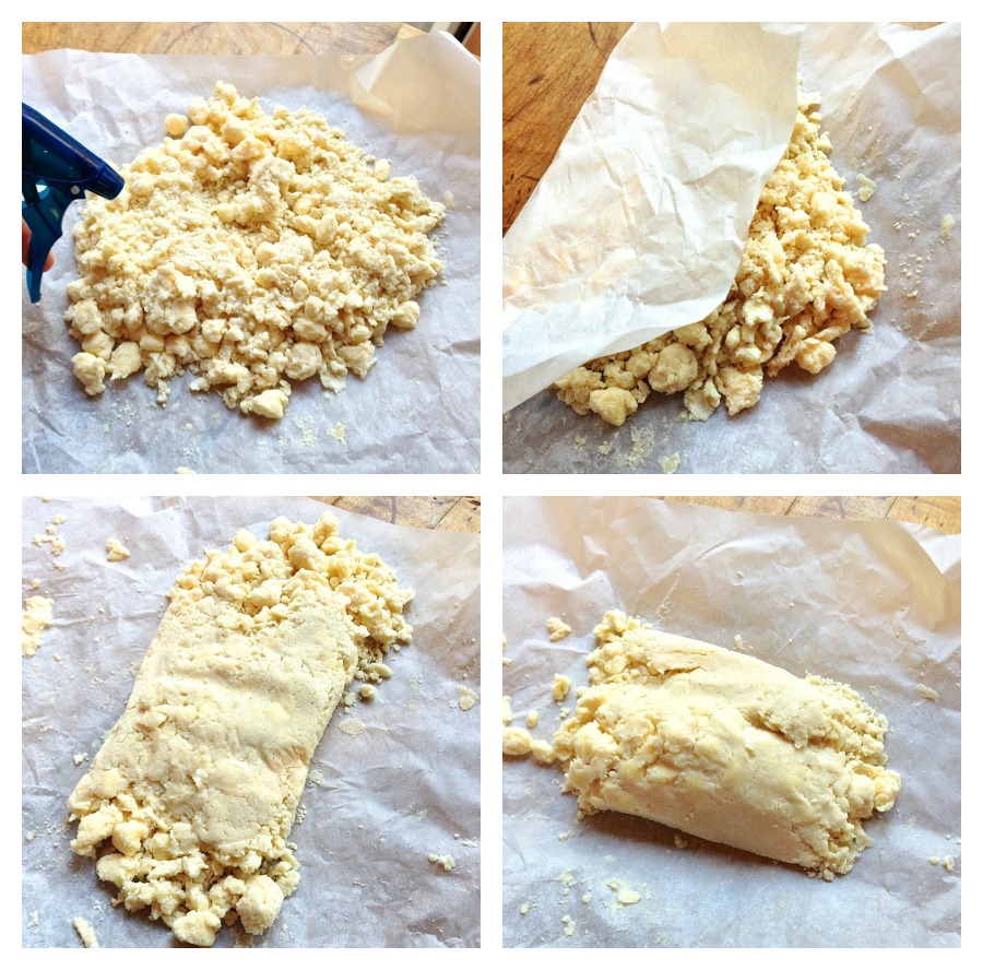 Spray the crumbly dough with a light mist of water, paying special attention to any dry/floury spots.