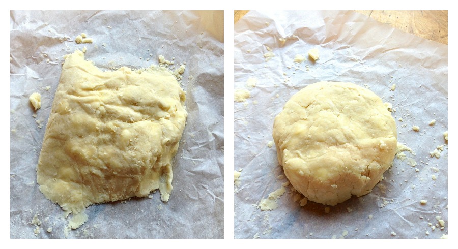Shape each rough square into a disk. The dough will still feel dry; little pieces will keep flaking off. Just gather them up and gently squeeze them back into the mass.