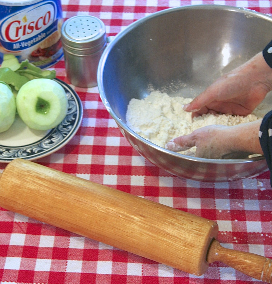 I scoop a handful of Crisco out of its can and work it into the flour. Then I add a smaller handful – palmful, sometimes – of softened butter, and mix again. These are my secrets, and I share them with you: butter and Crisco make s crust with better texture and more flavor than Crisco alone. You don’t need much butter, because even a small amount makes a difference.