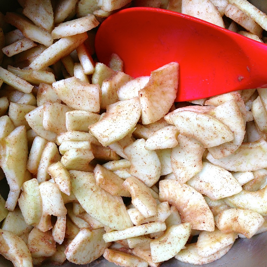 Take 5 or 6 Granny Smith apples. Peel, core, quarter, and slice them lengthwise, to a thickness that renders 4 to 8 slices per quarter, depending on the size of the apple. Put them in a large mixing bowl, tossing them with a couple of tablespoons of lemon juice if they begin to brown. When all the apples are sliced, add the following, mixing until the apples are well coated: white sugar, brown sugar, flour, cinnamon, butter, salt, and optional lemon juice. Don’t worry that I’ve forgotten the precise measurements; it’s more sadistic than that: I simply don’t use them any longer.