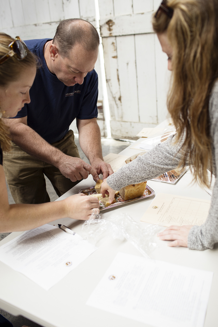 The judges sample whole wheat bread, one of the many entries in the baking competition.