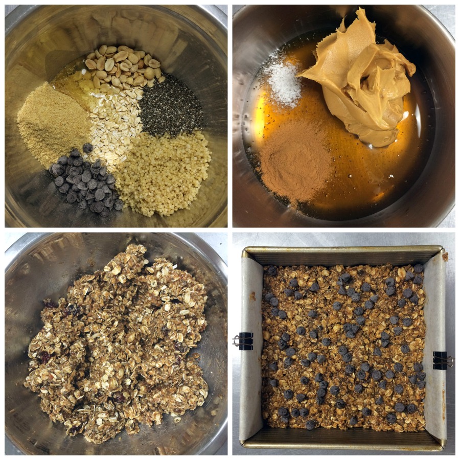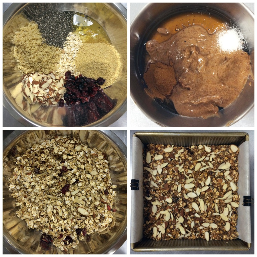 It's really crucial to place everything in the bowl in little piles. I found that to be the case, at least. It's a pretty lengthy list of dry ingredients, and getting distracted/called away could mean you lose track. Then you have to pick through your ingredients to try to remember. These bars aren't supposed to be a difficult thing to put together; let's keep it that way!
