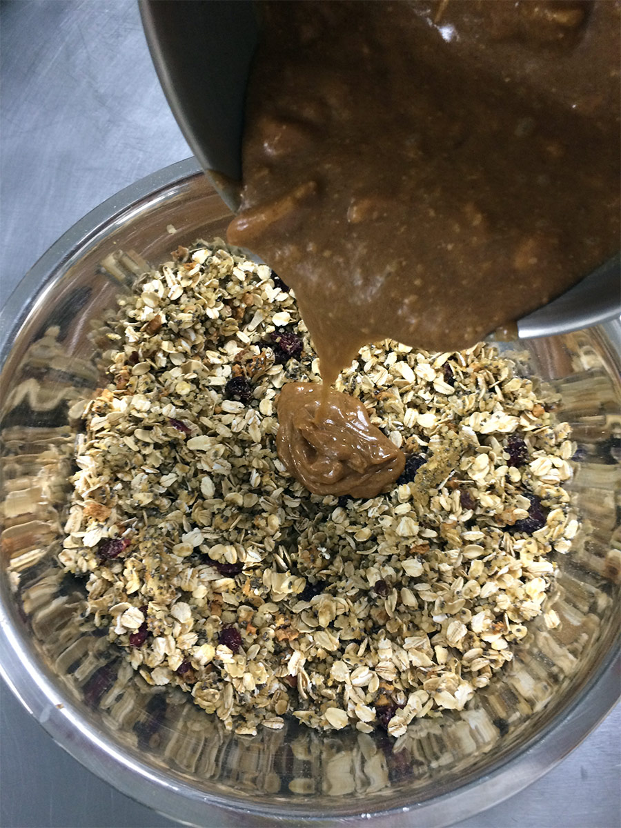 Pour the honey mixture over the dry ingredients and mix until everything is coated.