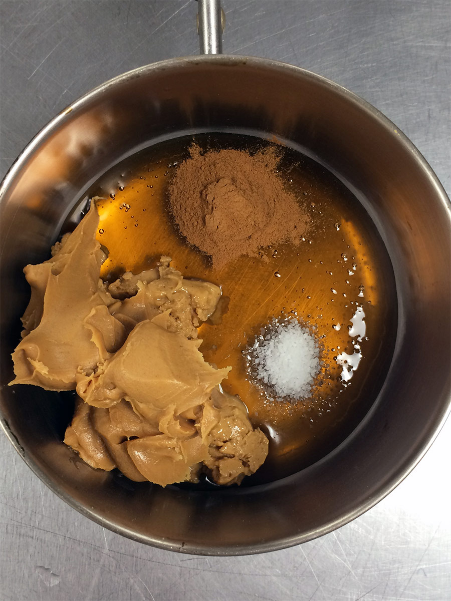 Combine 1/2 cup (170g) honey, 1/2 cup (135g) nut butter (I used unsalted natural peanut butter), 1 teaspoon ground cinnamon, and 1/4 teaspoon salt* in a small saucepan set over medium heat. Cook, stirring constantly, until smooth and well blended.