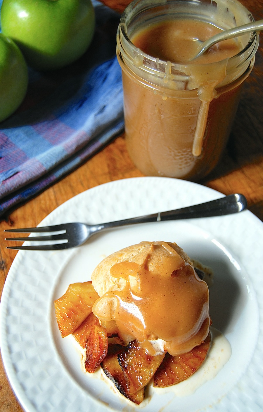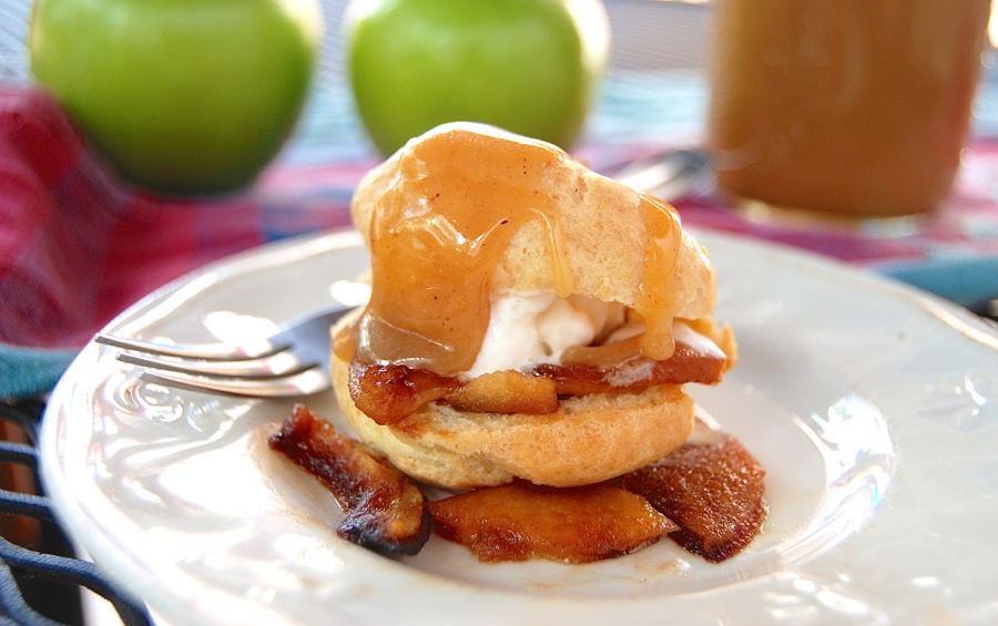 Autumn is stealing quickly onto the landscape, with its palette of golds, oranges, and rich browns. So a whole-grain cream puff stuffed with sautéed apples and ice cream, and drizzled with caramel sauce (salted, naturally) – all the components in varying shades of gold – is a perfect way to greet the season.