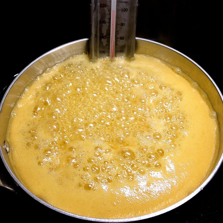 Hint: Use a deep enough pan! The caramel mixture needs to boil for 8 to 10 minutes or so, and it'll rise up the side of the pan quite precipitously. I lucked out with this pan – the caramel came to within about 1/2" of the top, then settled back again. Dodged that sticky bullet!