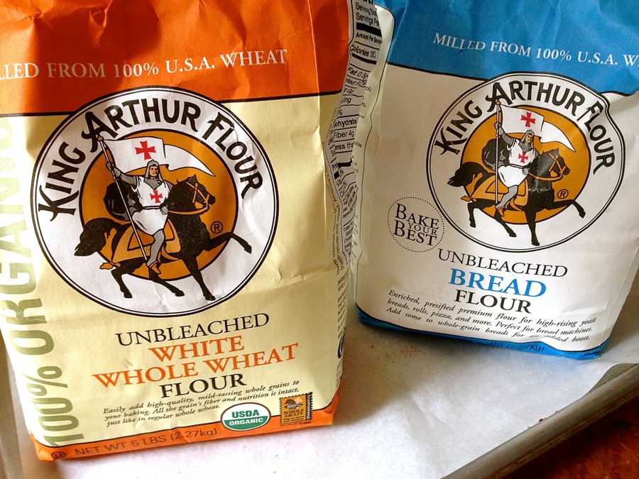 Combine 3/4 cup (85g) golden wheat flour and 1/2 cup (60g) bread flour in a small bowl, and set aside. (Or you can just use 1 1/4 cups (149g) all-purpose flour.)
