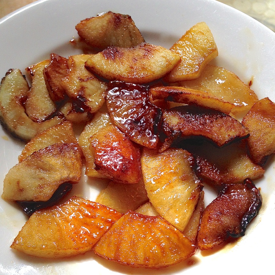 Next, get your filling ready. For every two profiteroles you want to serve, core, peel, and slice 1 large apple. Sauté the apple slices in enough butter to cover the bottom of the pan, and brown sugar/cinnamon to taste. A touch of boiled cider isn't amiss, either.