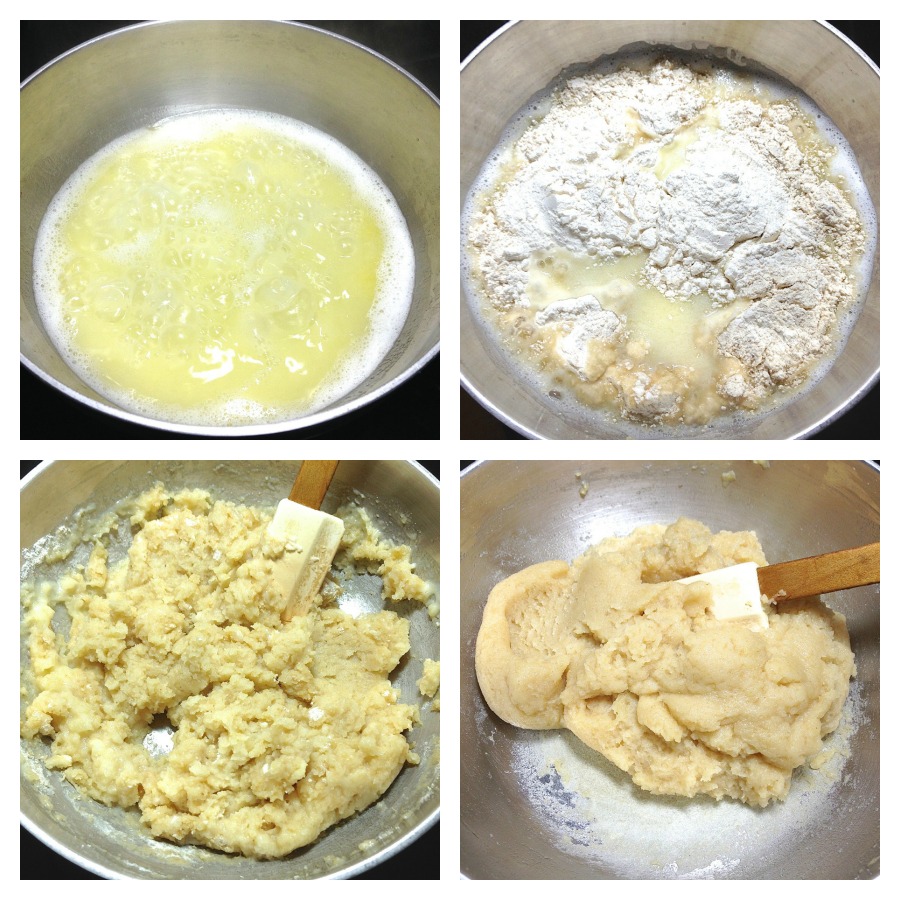 Bring the mixture to a boil over medium-high heat. Remove from the heat and add the flours all at once. Stir vigorously until well combined. Return to the heat and cook, stirring constantly, until the dough forms a rough ball, about 15 to 30 seconds.