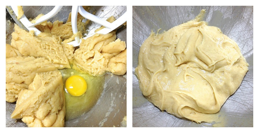 Beat in 4 large eggs, one at a time. The first egg should be fully incorporated before the second is added. The mixture will seems slippery at first, but will smooth out as more eggs are added.