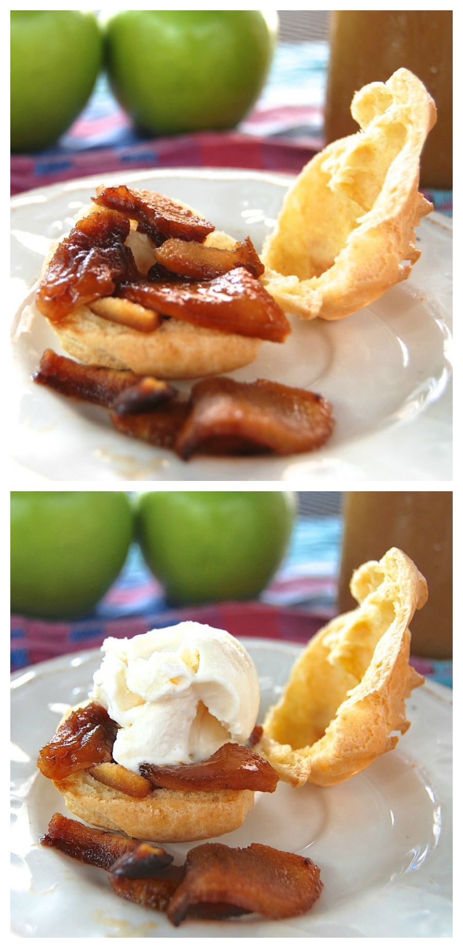 For each serving, slice a puff shell horizontally. Layer it with some of the sautéed apples, then a scoop of ice cream. I'm using simple vanilla here, but feel free to come up with your own apple-friendly pairing.