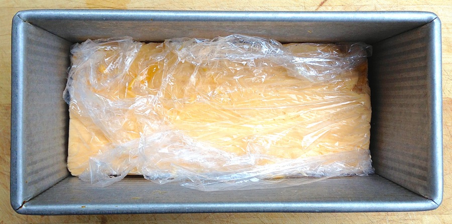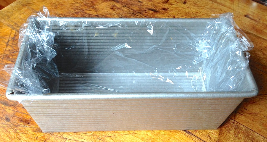 First, line a suitable container with plastic wrap. I used our 9" x 4" x 4" loaf pan, but go ahead and use whatever shape of pan you like.