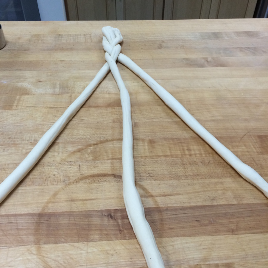 Divide the dough in half and set one piece aside, well-covered. Divide the remaining piece into three fairly equal portions, and roll each piece out to approximately 20". For step-by-step photos on how to get a nice even rope for braiding, see our six-strand braid blog.