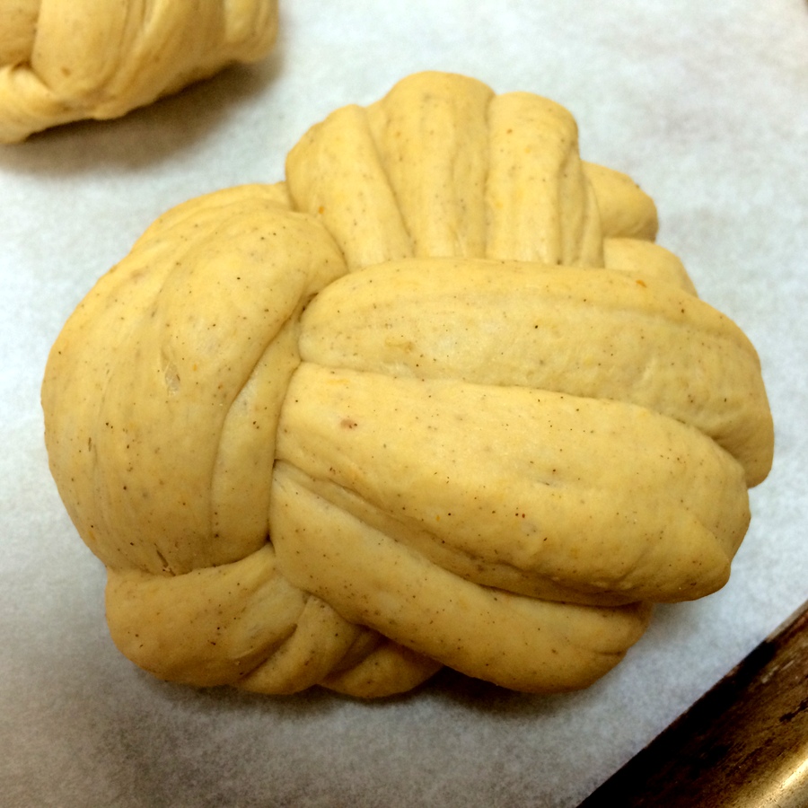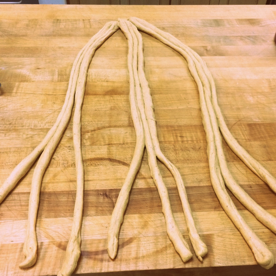 Now, let's take this braid one step further. Don't get freaked out by the picture, even though it does resemble a Kraken from the deep. It's just our Pumpkin Yeast Bread dough, divided up.