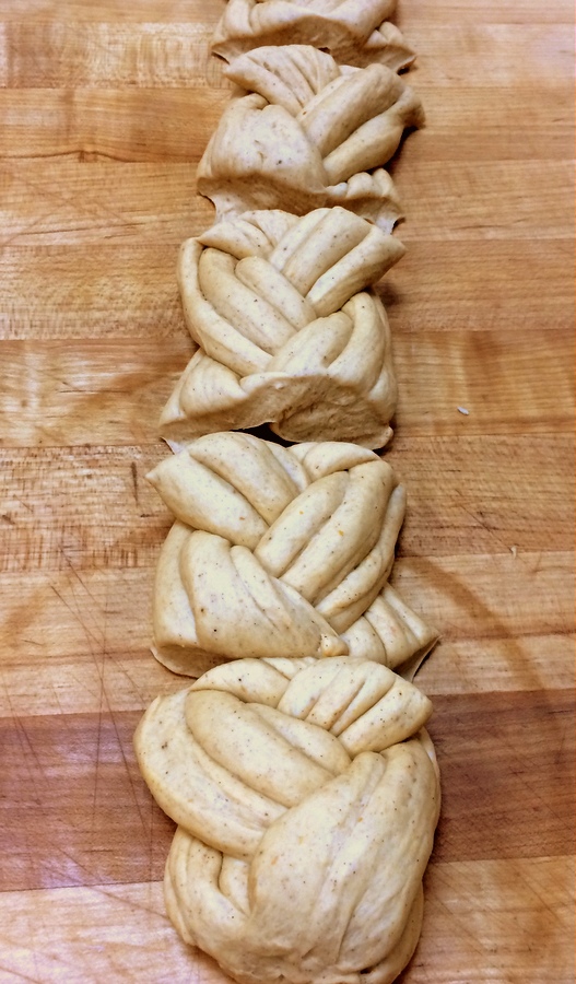 Divide your veeeery long braid into short pieces with a bench knife or sharp chef's knife. I like pieces about 4" long for a nice dinner roll.