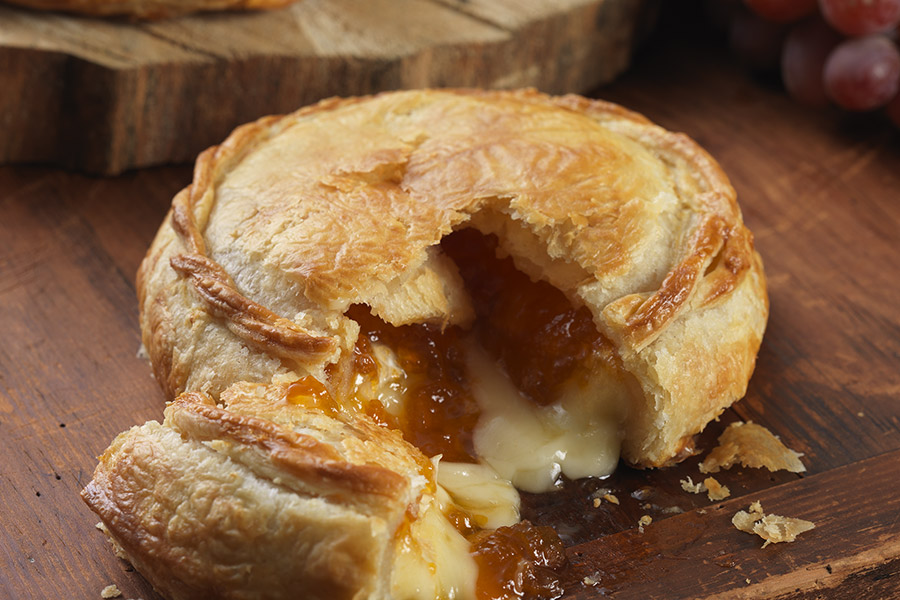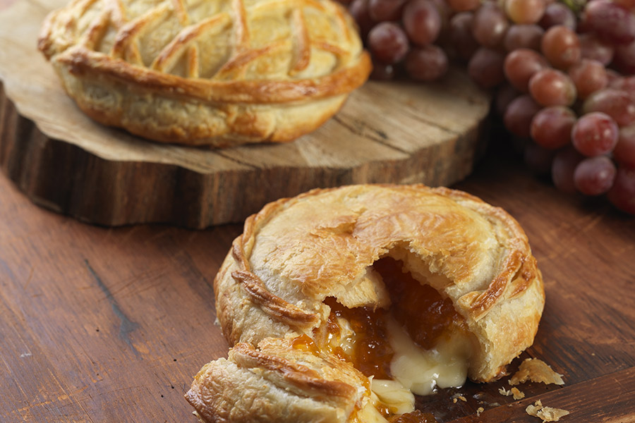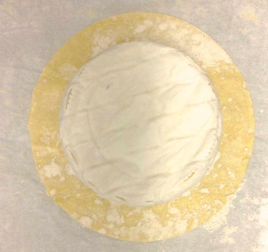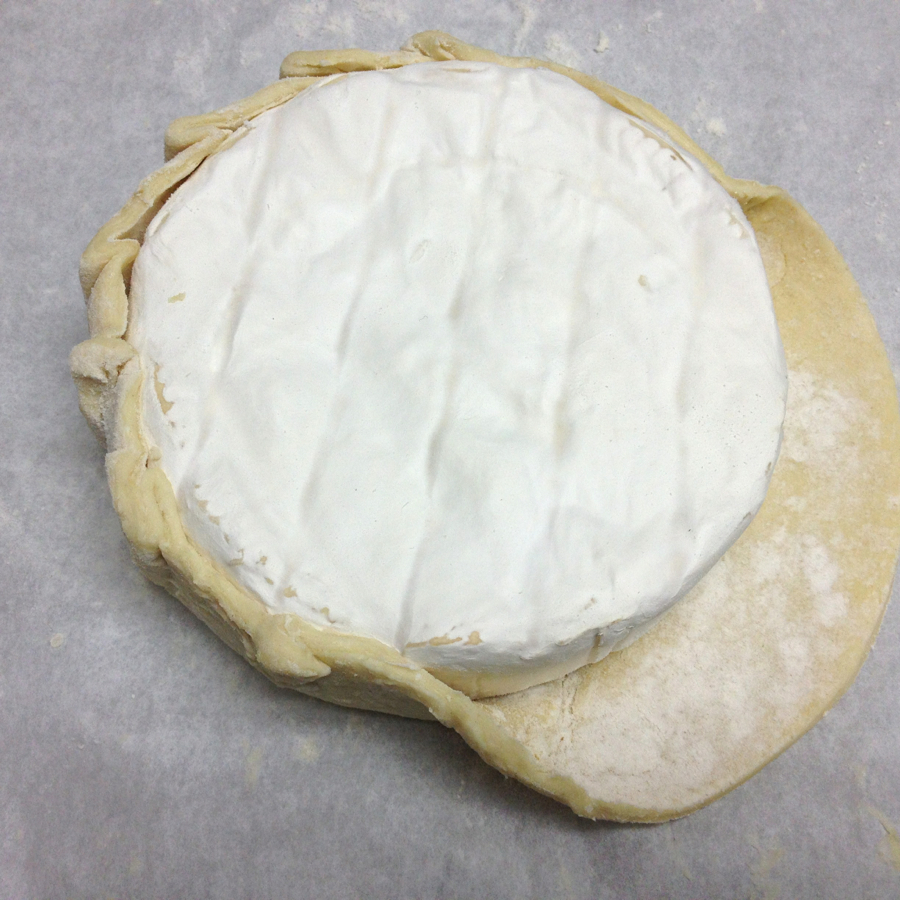 If you're using scratch puff pastry, roll half the batch to a 10" square. For store-bought, simply unfold a thawed sheet. Place a small wheel of Brie on the pastry. Cut a circle around it, leaving a 1" border of pastry.