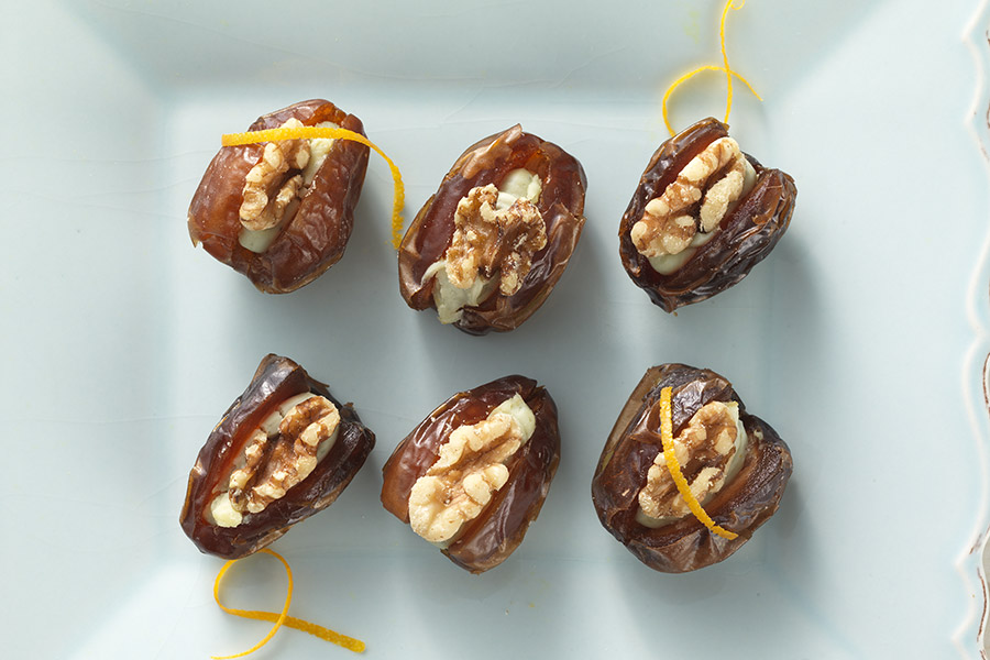 Here’s all you have to do: combine equal amounts of softened cream cheese and room-temperature blue cheese with a bit of grated orange zest. I use my food processor to make the mixture smooth. Then spoon or pipe into the dates and top with a piece of walnut. That’s it.